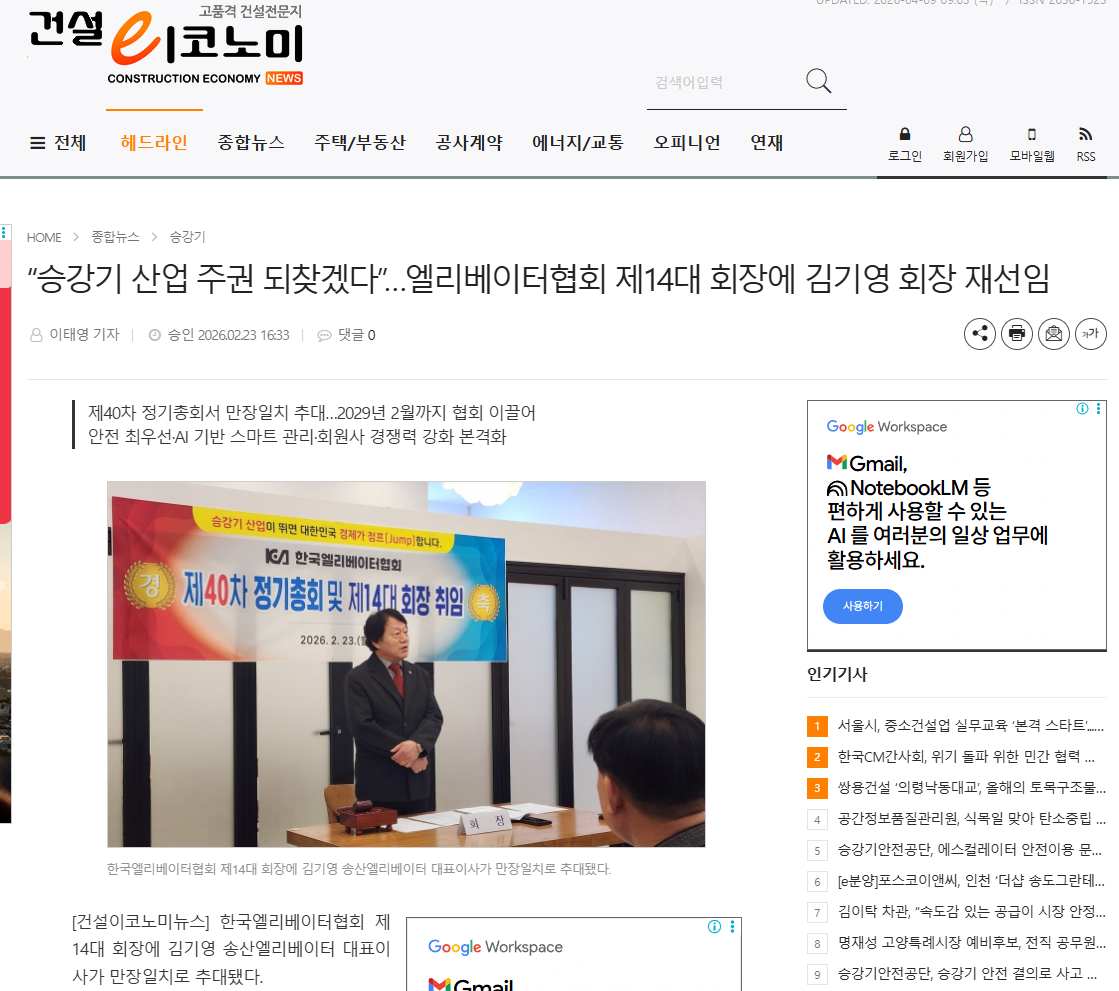 한국엘리베이터협회 제14대 김기영회장 재선임